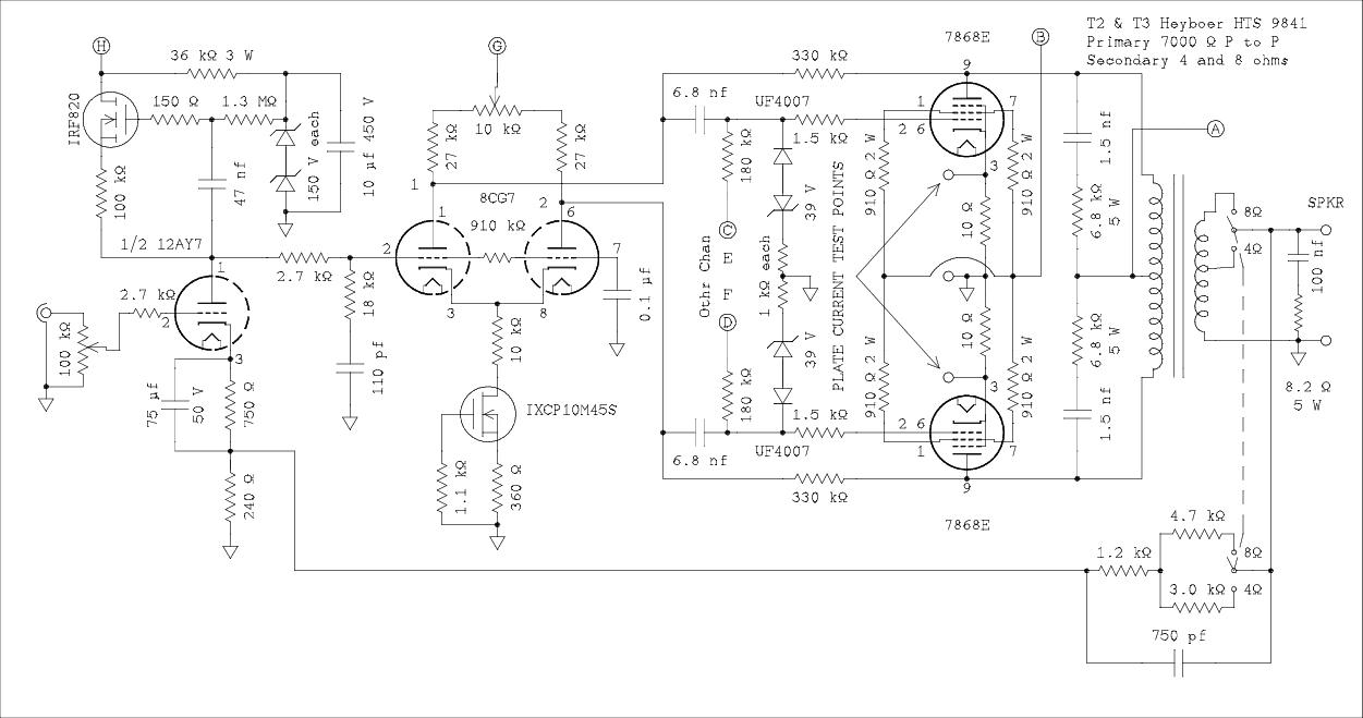 Tim employs snubbing networks on both the primary and secondary of the output transformer. Perhaps he had a little trouble with ringing. The square wave test was very good showing a nice wave with not a trace of overshoot or ringing.