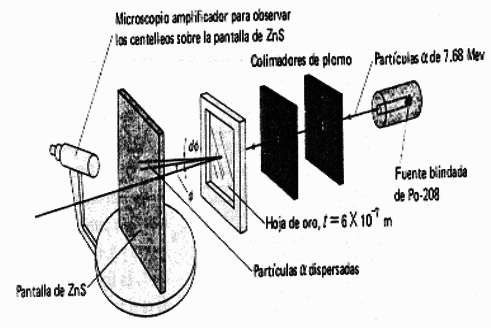 a al colisionar con una lamina delgada de oro. Como las partículas no se pueden ver, detrás de la lámina se coloca una pantalla de sulfuro de Zinc, que permite detectar las partículas a desviadas al atravesar la lámina, al producir destellos de luz cada vez que una de ellas hace impacto.Los resultados que arroja el experimento son en cierta manera contradictorios, ya que efectivamente muchas partículas