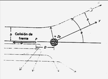 a (cuya carga es positiva) pasa en su vecindad la fuerza eléctrica de repulsión que actúa sobre ella hará que se desvíe de su dirección incidente con ángulos grandes si pasa cerca del núcleo, con ángulos pequeños si pasa un poco más lejos. Las cargas positivas del núcleo se llaman protones; la carga total del núcleo es Ze donde Z es el número atómico.