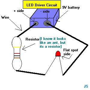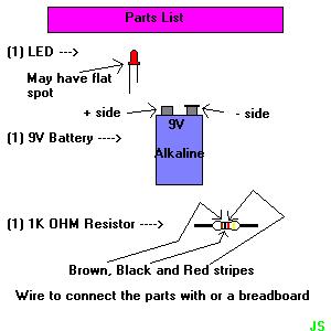 This is probably one of the easiest crcuits you'll ever deal with when building an electronic circuit. It consistes of three parts, a 9 volt battery, 1K ohm resistor, and a LED (Light Emitting Diode). All of these parts you can get from radio shack (what we call Rat Shack), ahem, or any other electronics place. Also, when getting the resistor, be sure to get a brown, blak, red coded resistor to ensure its a 1K, if it isnt, you may get the results below. If you dont want to mess with te color bands however, just ask for a 1K ohm resistor.. that'll be the right one. Its VERY important to the life of the led for you NOT to directly 'test' the led by connecting the led across the 9 volt battery. Doing so will result in what my teacher Mr. Krauss refers to as "MAGMA" :P It will get VeRy bright, then either smoke, get very hot and or pop, destroying the led. What do you think they teach us at college? Not much. Just Kidding!! They went in great detail to teach us about current and its powers: One of the things they emphasize is the current limiting properties of a resistor. Putting the 1K ohm resistor in series with the led limits the current throught the led and makes it light, but protects it from too much current. See the diagram below for circuit and parts list. Another thing you need to watch is the 2 legs of the led. One of these will b shorter than the other or have a flat spot above it on the epoxy part of the led. The one with this flat spot is the NEGATIVE side and will go towards the - side of the battery. Dont worry though, if you connect the led backwards, but be sure to use the 1K ohm resistor, you wont burn out the led, it just wont light. If this is the case, just reverse the leds legs and reconnect it. This is a simple circuit, and I have used it as a mini flashlight by adding a fer high-brightness leds in parallel with the one shown, but you neednt get into that now. all you need is the parts show, its pretty simple to do :) If you have any questions, you can email me at my address below, but depending on how full my mail is, and the bulk of activity during the week, I cant guarantee when I'll be able to get back to you, although I WILL send you a reply if at all possible :) Have fun building it and 'Let there be light!' --Josh Sawyer (KG4SPO)