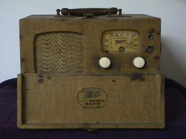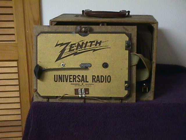 Looks like a suitcase, doesn't it? That's exactly what Zenith had in mind when engineering their very first portable radio. They wanted to design a radio that would be lightweight, easy to carry, would run off battery power as well as wall current, and be durable enough to withstand years of wear and tear. The first ideas for the radio were conceived late in 1938. At that time, Zenith was mainly concerned with developing a radio that would be practical for use on a yacht or train. Several design ideas were submitted before the tweed suitcase cabinet was adopted. Really, what could have been more practical for portability than a suitcase? Remember, it's the late 1930's and the average battery powered table radio weighs about 25 pounds! Production began on the all new portables in mid-1939. Zenith offered a line of over ten different suitcase style portables, all being sold as 1940 models, priced from $29.95 for a four tube battery model in basic cloth to $59.95 for a five tube cowhide covered version with wood trim. This particular model retailed for $44.95. The name "Universal" was exclusively reserved for the highest quality portable of the Zenith line. The new portable radio hit America at a time when people were becoming "mobile" again after ten years of idleness. Portables outsold many table and console models in 1940. By the end of the model year, RCA, Philco, Motorola, General Electric, Silvertone, and many other radio companies were offering their own suitcase portables. But Zenith had one thing the others didn't. Something that would lead to over 40 years of portable success. The Wavemagnet antenna.