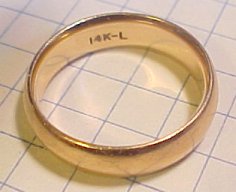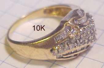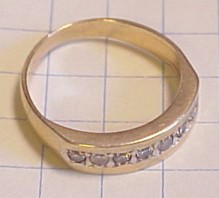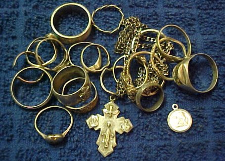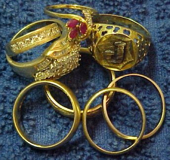 16 pts. total weight (from jeweler) 6.4g size 9 10K cocktail ring with 83 diamonds 3.5g size ? 10K "J" initial ring 3g size ? 14K, 3.5mm wide wedding band 1.7g size ? 14K ring with 3 garnets and 3 diamonds 8.5g size 9 14K-L Man's comfort-fit, 6mm wide wedding band with interesting design 1.6g size ? 14K White gold ring 6.5g size ? 14K-L comfort-fit, 5mm wide wedding band |