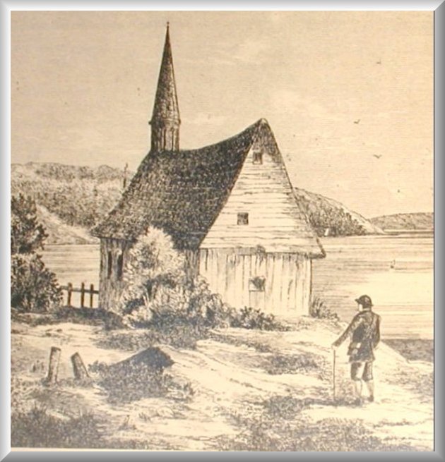 A2. Gravure représentant la deuxième chapelle de Chicoutimi(1726-1856), tel qu'elle apparaît en 1843.