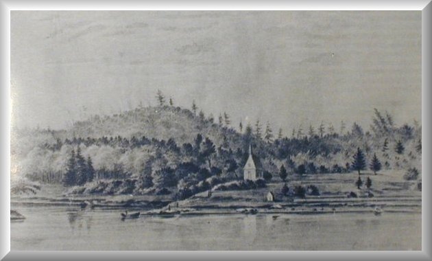 | A6. Esquisse du site de Chicoutimi vers 1840. Cette aquarelle anonyme est datée approximativement de 1840, soit deux ans avant l'arrivée de l'équipe de McLeod. On y voit la silhouette de la chapelle du Père Laure, campée au bord du Saguenay, entourée d'une forêt omniprésente, en grande partie formée de pins. |