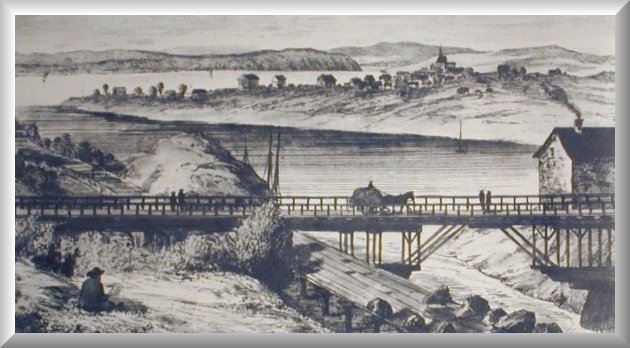 | A9. "VILLAGE OF CHICOUTIMI, FROM BEYOND THE CHICOUTIMI RIVER" en 1871. Il s'agit d'une vue de Chicoutimi, à partir du pied de la côte du Réserve. On voit au loin l'aspect général que présente le village de Chicoutimi en 1871, regroupé autour de l'église paroissiale. et,, à l'avant plan, la "dalle" - ou glissoire - qui amène l'eau motrice à la grande scierie Price. |