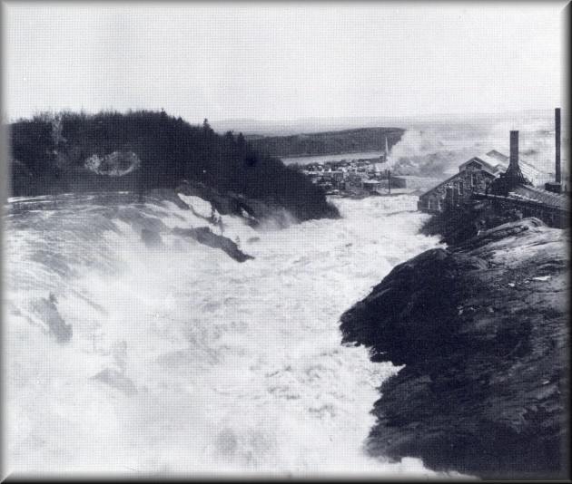 C7. La localisation des usines de pulpe, au pied des chutes de la rivière Chicoutimi, leur assure l'énergie électrique suffisante à la fabrication de la pulpe. Comme la fabrication d'une tonne de pulpe requiert alors l'utilisation d'une centaine de chevaux-vapeur, c'est donc une production de 120 tonnes par jour que peuvent envisager en 1895 les premiers promoteurs de la Compagnie de Pulpe. Une première centrale hydro-électrique est construite en 1895, sur une île située au pied de la deuxième chute, à l'instigation de la Compagnie Electrique de Chicoutimi, créée par J.-D. Guay à la fin~ 1894. Elle répondra aux besoins des premières usines de la Compagnie de Pulpe construites en 1897 et 1903: la produrction quotidienne de pâte de la première usine, en 1898, n'est que de 35 tonnes. |