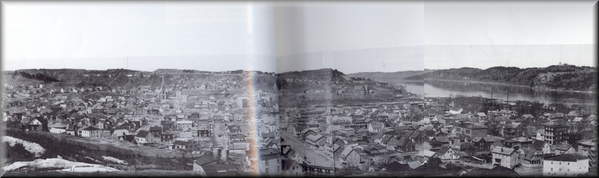 C20. Vue panoramique des quartiers centre et ouest, en 1924. La photo peut être datée exactement, en raison de indications précises qu'elle fournit. D'autre part, le pont du chemin de fer au-dessus de la rue Price et de la rivière aux Rats est encore en bois: il ne sera refait en béton qu'en 1925 (il vient d'être démoli il y a quelques années). De même, la chapelle Sacré-Coeur, bien visible à droite, ne sera démolie qu'en 1930. L'on peut se faire une idée assez juste de l'expansion du quartier en comparant le développement domiciliaire de la rue Bossé sur cette photo, quasi à son maximum, avec celui de la photo 41, où la même rue n'est qu'ébauchée. |