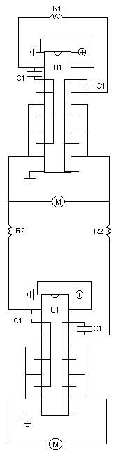 Master-Slave Bicore Walker - This is a circuit that can be used to control a walker. It uses two bicores coupled together to syncronize the movement of the legs. The top bicore is the master, that controls the front legs. The bottom bicore is the slvae that controls the rear legs.