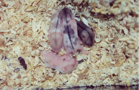 The babies are born naked, and are about the size of a paperclip. NOTE: Do not disturb the mom while she's giving birth and do not touch the babies at all until they are 16 days old becuse this will change their scents and the mom will think they are not her babies and will reject them. At around 4 - 6 days old their skin should start to pigment into the fur color. At 10 days old the eyes should be open and the babies should be up and walking around the cage. At 16 days old you may hold them for a short period of time. You may then clean out the cage. You could also feed them their fruits and vegetables at this time.