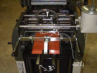 Ok, I don't really remember the names of the individual parts, so this may not be exact. First, you need to locate the elevator release lever( 20), and slide it to the right. Next, take the elevator crank(21) and turn it in the down direction(i think its counter-clockwise). Now you need to get the proper size stiffiner(22), and place it on the pile supports(23), this is where you put your stock. Next, turn the elevator crank to the right to raise the stock to the feeder. There are two sheet seperators(24) at the top. Raise the stack to the bottom red line on the sheet seperators. Ok, now you should be setup, first, make sure you have scrap to run while you get the press set up (scrap is the old paper that has already been run and has had scumming or something on it). Ok, back to the main controls, there is a feed control lever(25) above the elevator release lever, as you move the plate lever into third position, pull the feed control lever to the left. This will start the feed. Now, if everything is set properly, you should have blank sheets of paper at one end, and a pile of printed sheets starting to accumulate at the other. Stop the feed, and move the plate lever into first position. Take one of the newly printed sheets out and check it for alignment. To do this, you will need to get the rule(the long silver thing in the ink picture) out of the top drawer. There are two notces on the top of the ruler. Take the sheet and align the notches with the edge of the page. Take the measurments of each of the sides and compare them. Unless otherwise specified, the top and bottom should match up ,and the sides should be equal. If this is so, you may continue running the job. If the page is out of alignment(which it usually is) you will have to adjust the press.