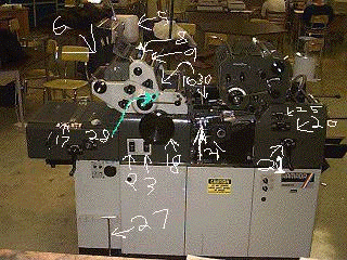 There are three main ways to adjust the press, the first is to adjust the plate cylinder alingment. To adjust it, you have to have the T wrench that is on the side of the press(27). Take the wrench and insert it into the adjust hole(28) (note- you have to have the press in the "0" position for the wrench to fit through). Turn in 1/4 turn to the left. TURN IT 1/4 TURN ONLY!!. I can't remember how many times people have loosened it too much and the screw has fallen out, shutting the press down for a day(What a bargin!). Now, leaving the wrench on the nut, move the wheel(18) in the direction it needs to be turned. It helps to move to the 0 position on the little ruler that corresponds with the plate cylinder(16). The second method of adjusting the press is re-mounting the plate. This should be done if the plate isn't on straight. All you have to do is take the plate off and put it back on, trying to make it mount straighter. The third method is adjusting the stops for the paper(30). in order to do this, you get down on your hands and knees and,...NOOOO!!, loosen the two set screws(31) that hold them. Once you get them loosened, simply move them in or out as desired.