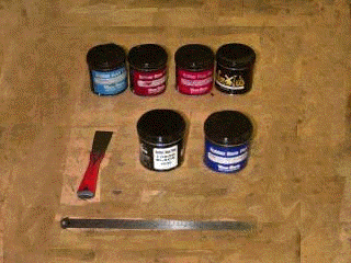 To do this, take an ink knife(the red thing), and a jar of ink(duh). Open the jar, and using the knife, pull out some ink. This is done by putting the flat metal end of the knife onto the surface of the ink, and carefully pulling the knife in a circular direction around the suface. There should now be a large amount of ink on the knife. Take this and smear it on the tray, pushing it against the ink roller(13) with the knife. Turn the roller towards the ink, and the ink should get pulled into a bead. There are several inking keys(14) under the tray, these are used to adjust the amount of ink that the main roller picks up. Adjust these by screwing them in or out while you turn the ink roller, you should get them set right when there is a thin-but-even coating of ink on the roller. Congratulations, you're almost ready to run the press.