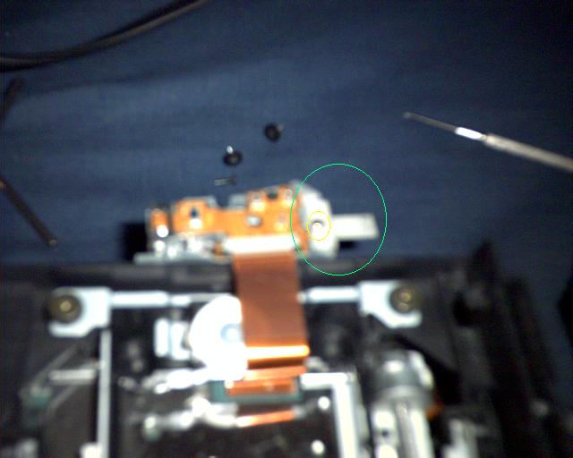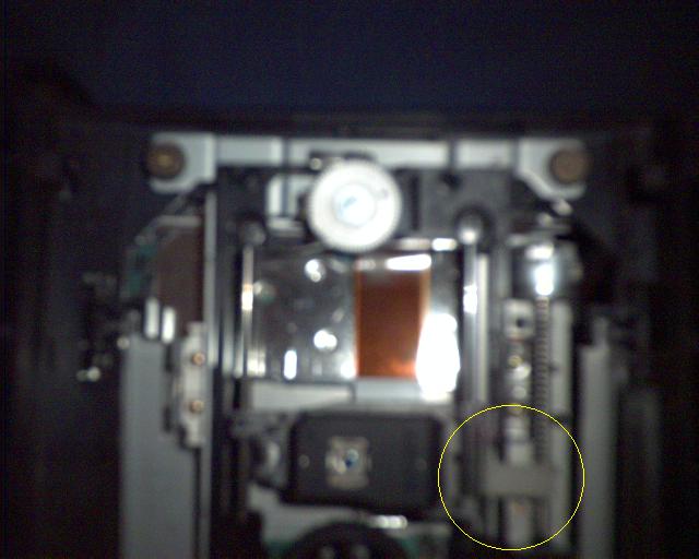 Now rock the cable back and fourth until the cable comes out of the laser. Now if your new laser has the laser arm the white piece of plastic pictured with a yellow circle below