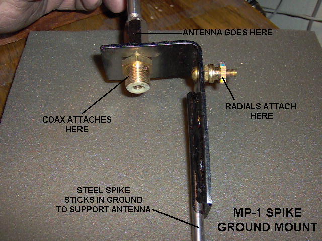 To use the mount, screw the antenna into the 3/8" socket, and the coax into the SO-239 and then shove the spike into the ground while keeping the antenna as vertical as possible. Attach the ground radials to the brass bolt and spread them out on the ground like spokes in a wheel and then tune the antenna to frequency. I use this mount with my MP-1 portable antenna, but there is no reason that it couldn't be used with other antennas that have the 3/8" x 24 thread base such as the Hamstick type mobile antennas and the Hustler coil loaded mobile antennas making them double as field antennas.