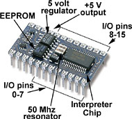 In my senior research project I used the Basic Stamp 2-SX and the Basic Stamp 2p. Both of the Basic Stamps are manufactured by Parallax, Inc. “The Basic Stamps are small computers that run PBasic (Parallax Basic) programs. They have fully programmable I/O (input/output) pins that can be used to directly interface to TTL-level devices, such as buttons, LEDs, speakers, potentiometers, and shift registers.” (Getting Started). This thumbprint-sized microcontroller is very popular among robot enthusiasts, electronic and computer engineers, and certain science instructors looking for a fast, inexpensive alternative to microprocessor-based systems. The Basic Stamp runs programs downloaded into the Stamp form a computer. Once programmed, the Stamp holds the program in permanent memory. The instructions are converted to code, which the microcontroller can understand. An example would be an instruction given to the Stamp telling it to turn on an LED (light emitting diode) and then maybe moving forward two feet. There are several deferent kinds of Basic Stamps, the Basic Stamp (“BSI”), Basic Stamp 2 (“BSII”), Basic Stamp 2-SX, and the Basic Stamp 2p. The physical layout of the Basic Stamp 2-SX and the Basic Stamp 2p are designed to fit 24 pin and 40 pin IC holders respectively. The Basic Stamp 2-SX comes equipped with sixteen I/O lines, a 5 volt regulator, 50 MHz resonator, an interpreter chip and memory. “The Basic Stamp uses two kinds of memory: EEPROM (electronically erasable programmable read-only memory) and RAM . The EEPROM memory is used to store the PBasic interpreter and programs; the RAM is used to store data while a PBasic program is running.”(McComb 482). The EEPROM is non-volatile, which means if the power is removed the contents stored in the chip remain there. The RAM has volatile memory, which means the contents are lost if power is removed. The Basic Stamp 2-SX has 16 K bytes of EEPROM (program storage) and 64 bytes of RAM (for variables and data). Of those sixty-four bytes, one is used for the program and sixty-three for the user.