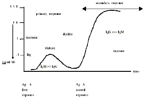 Once the antigens are circulating around the body system, the rabbit’s immune system detects the presence of such particles and sends its first set of antibodies, IgM (Antibodies are formed from our bodies B cells). IgM attaches themselves to the antigen receptors and bring them towards the lymph nodes for processing.IgM is the major component in the primary response followed by IgG antibodies. This first response declines soon after the first antigen challenge. The second dose of antigen is then introduced 1 month later, into the rabbit; this time the dose is reduced in amount. The second response to the antigens is more swift and efficient as IgG as higher affinity to the antigens. Also, there are more memory cells that can recognize this specific antigen, so more IgG are produced to target it and bring it away from the system. We are immunized against Hepatitis B in a similar way, so that our immune system can recognize the Hepatitis B antigens and produce efficient “killer” bodies, the antibodies, to prevent us from being susceptible to the disease.