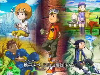 As the elevator goes down the light above the door blinks down the number of floors. After the last floor the blinking light keeps going past the numbers. The elevator drops and Tomoki is trying to stay on his feet when he sees his cellphone rematerialize into a digivice. On the outside you see the elevator go down a long seemingly endless shaft until finally reaching the bottom with a huge bang. Walking out he sees that around the elevator are more elevators surrounded by long trains that are in turn surrounded by about 2-dozen other kids. In the group are two bullies seen pushing Tomoki crying on one of the trains and shutting the door. A whistle blows doors shut and some of the trains start leaving. Seeing Kouji get on a train Takuya runs and jumps for the nearest train he can find landing on the caboose. Takuya then walks through the train and comes across Junpei Izumi and Tomoki. They are introduced and watch through the windows as the digital world and groups of digimon fly by.