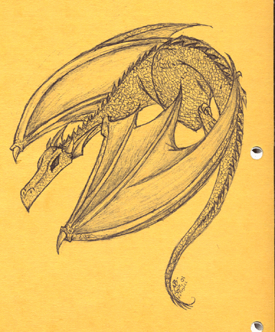 > A dragon that I doodled on the back of my wellness notebook one fine day in the beginning of the school session.