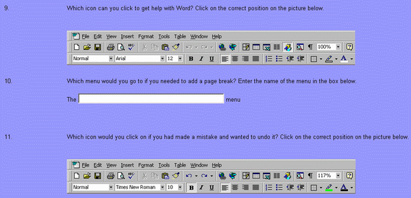 The diagram above shows that the test uses a combination of questions whereby the answer is entered by simulating performing the action in Word, or by typing an answer into a dialogue box. Accuracy is essential for a successful test, and users will find this more challenging that the WebCT multiple choice test - never the less this is a good way of testing your knowledge so is an essential step in the LMU LearnECDL process. Once again it is permissable to have a copy of the package that you are being tested on open so as you can check answers - it is all a part of the learning process.