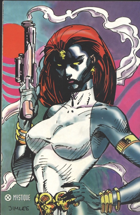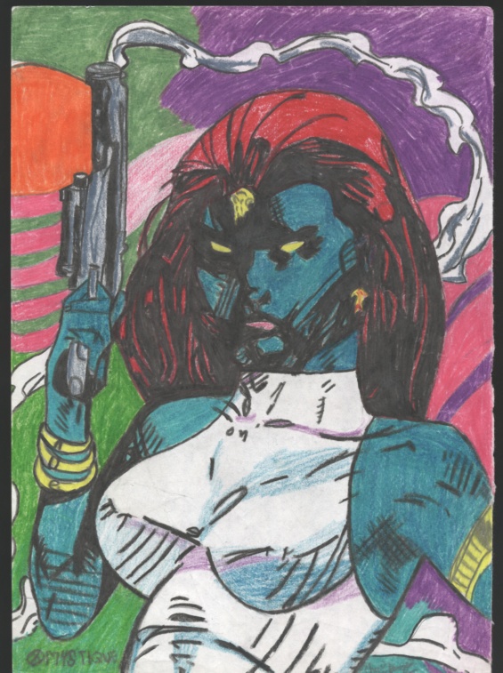 This is a drawing of Mystique. I like this one but i think her neck and face look a little funny. Maybe too big. Still it's isn't too bad.