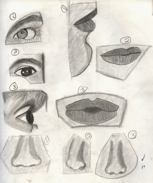 These are from an art assignment i had in grade 10 i believe. Now why would i put these odd's and end's ensemble of facial features as my first drawing entry you may be asking. Well that is simple. I like how they look, and they lead into the next drawing i am going to post. As you can see i did very well on this assignment, earning a 10 out of ten! :)