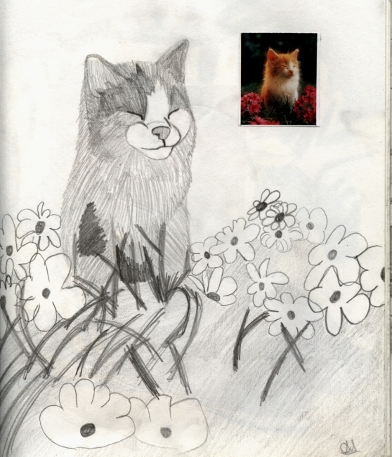 Again, this is another picture i drew on another day through another boring parenting class. haha, i am surprised i never got in trouble, i sat near the front and the teacher always stood in front of my row. Oh well! i like this one, though i didn't really finish it, (and i did a half assed job of the flowers LOL) there are suppose to be more flowers up front and more grass behind the cat, but i didn't feel like doing that much detail, plus that class wasn't THAT long LOL, so i didn't have the time either. I like it. turned out pretty good.