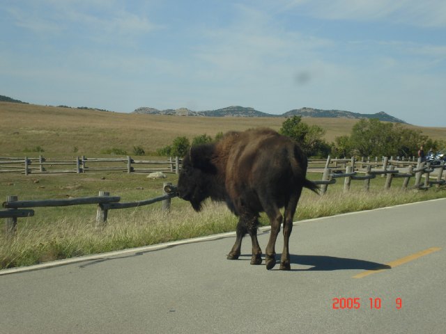 Buffalo Crossing the road in Oklahoma