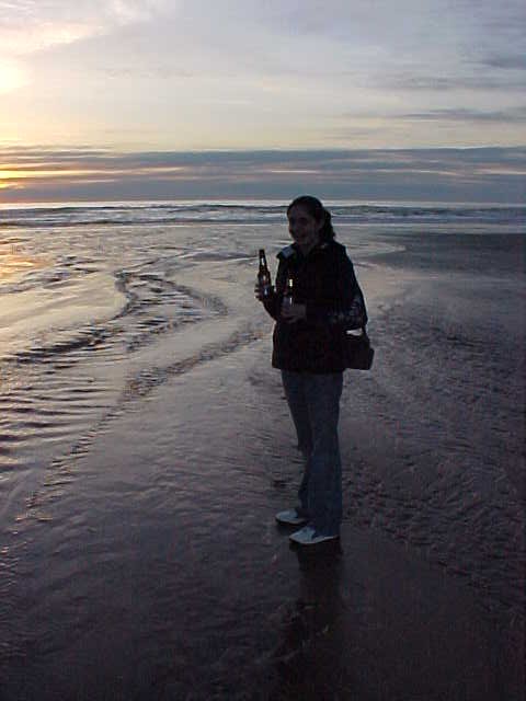 Sun's almost down over the horizon! Sarah on the beach double fistin it!