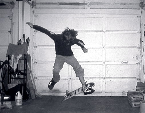 *WARNING!* The picture shown above of me doing a kickflip does not show good form. As you can see, my front foot is too low, and I'm not centered over the board very well. It's hard to take a picture of yourself with a self-timing camera doing a trick! The new school kickflip, shown here, was invented by Rodney Mullen back in the 80's. As you probably know, it involves popping the tail, dragging your foot off the corner of the board, causing it to flip, and landing back on the griptape side. Here's how it goes: 1) Put your back foot on the tail, and your front foot at about the middle of the board, with the heel slightly turned toward you. 2) Start the trick by popping the tail pretty hard, then immediatly dragging your foot up the board, like an ollie, and off the heel-corner of the nose. 3) STAY CENTERED OVER THE MIDDLE OF THE BOARD, THIS IS VITAL TO LANDING IT. 4) Wait until you see the griptape, then catch the board with your feet. 5) Land with your knees bent. This may seem impossible at first, but just keep trying and you'll get it. Also try putting your front foot in different positions, because my stance may be different from yours. Good luck!