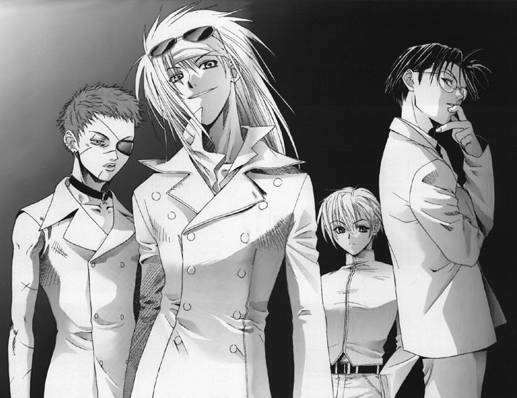 I don't understand why everyone's in varying states of undress in this picture...and why Farfello is wrapped in bloody bandages *ew* and Schuldig is cutting off his own clothes with his knife. Maybe he's just not all that good with a knife...And why does Nagi have to be in the front? That's illegal! Yeesh. Crawford looks good in his glasses...yet he's taking them off... "Do I look like Superman now?"