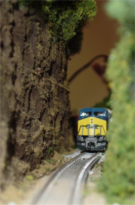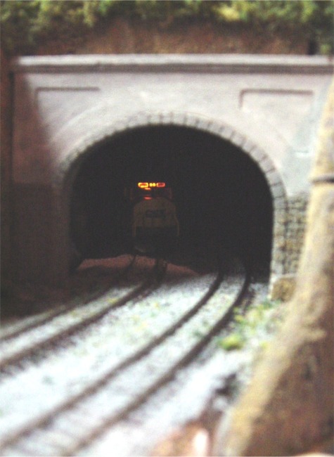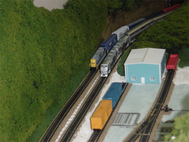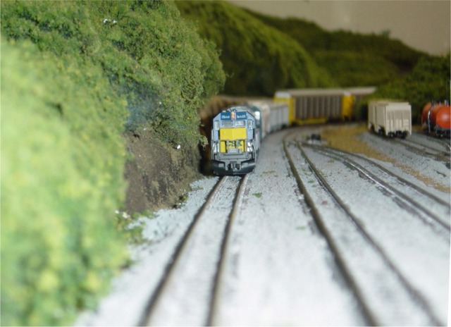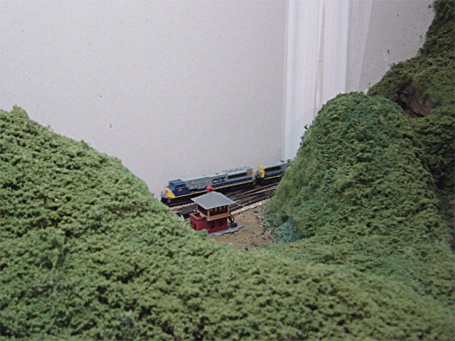 The night before the operating session I added a section of "trees" behind Glencoe. Here's a shot of a freight headed upgrade and into the tunnel behond Glencoe. I have not yet put in the tunnel portal here as it is not yet painted.