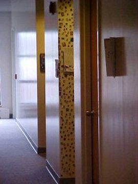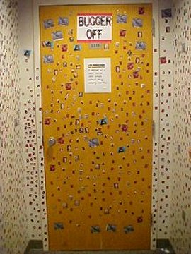 After taking the Ugly Men down from the bathroom (laughing all the way), we placed them in Wildcat's doorway.