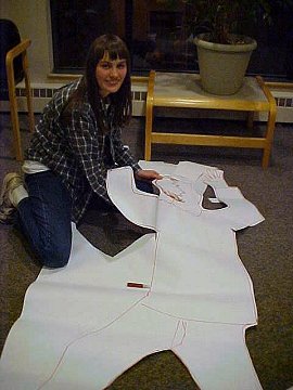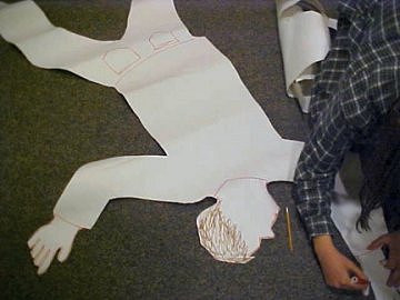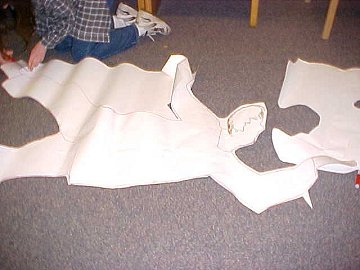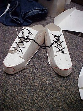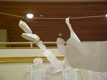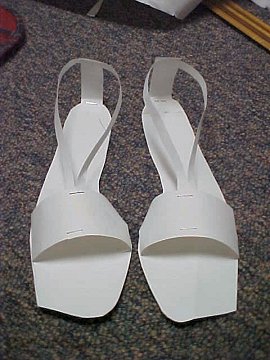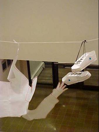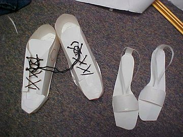 The first incarnation of the large white sheet of paper scavenged from the theatre shop. First the shoes... aren't they cute? Then the inspirational memory of shoes flung over a power line. Then the desperate man trying to save his footwear. Finally a pair of ladies' shoes to keep them all company.