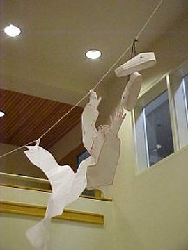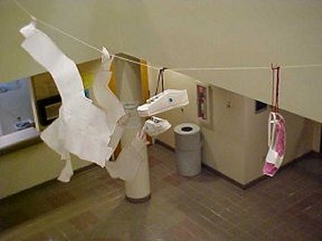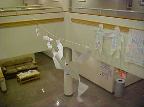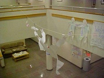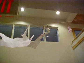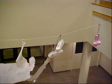 Some black yarn and away we went, down to the lobby to hang them across the railing. When this bored us (it took several hours) and the hour was getting late, we unhooked the lines and held them, swinging the line and the attached shoes wildly back and forth, up and down, to torture the people who would occasionally walk below. It must be mentioned that the One With the Plastic Rat in his Office saw this project and was amused.