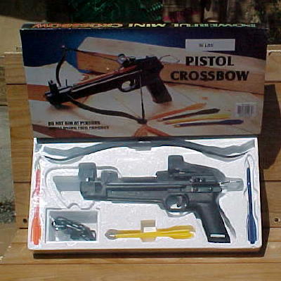 This cool 50 lb Pistol Crossbow is very fun. It comes with every thing seen in the picture. 3 plastic arrows with metal tips, and all other neccessary parts. It takes a bit of strength to assemble it initially, but after that it is ready to go forever. It shoots very fast, and accurately, it has adjustable crosshairs. It is very fun, but it is not a toy. 18 yrs and older please.