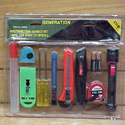 This Generation Multifunction set includes 10 different items, which are great for home or office. It has a flathead, and a phillips screwdriver. It has a scraper, 2 break-off razor blades. 1 large cutter. Has 1 (6ft) steel tape measure. A flashlight with 2 aa batteries. Also has a glue pen and 1 other item. It comes sealed in plastic case as pictured. Has the Price $24.95 on the box, but you can get it for a great price.