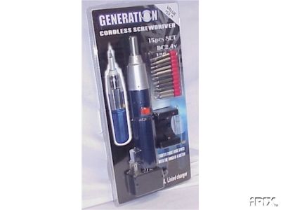 Generation 15 piece cordless screwdriver includes 13 assorted sized bits and UL listed charger. IT is reversable. It runs at 180 rpm, 2.4 volts. Item is pre-marked $59.99, but you save big.
