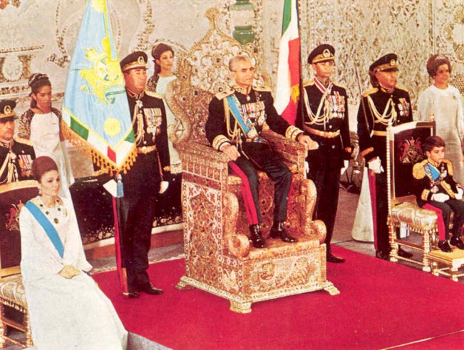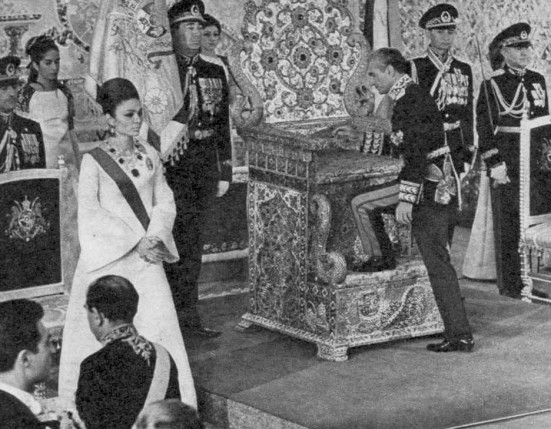 Three minutes after the Empress, it was the Shah who entered the Grand Hall, preceded three generals, the most senior military officer of each of the three branches of the Armed Forces: the Imperial Navy, the Air Force and the Army. The Shah walked up the long red carpet, acknowledging the bows and curtsies that came from either sides of the Grand Hall. He was walking towards a ceremony that he had delayed for over a quarter of a century and as he walked towards the Naderi Throne he surely did so confident that his work would make Iran a modern country. He reached the bejewelled throne and turned back to the entrance of the room, standing. His wife, the Empress, curtsied when the Shah arrived at the throne.