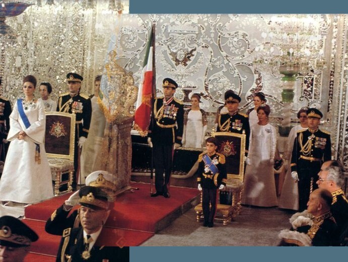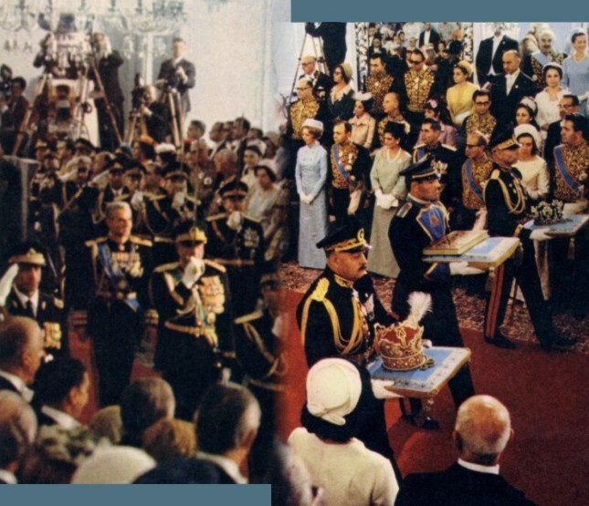 Moments later, three officers entered the Grand Hall carrying the Koran, the Imperial Crown of Iran and the Empress of Iran’s Crown. The sight of those magnificent jewels, which would take an essential part in the ceremonial, sparkled the amazement among the large hundreds of guests. The officers, carrying the items over blue cushions with the arms of the Pahlavis embroidered in the centre, steadily progressed in the room and everything was ready then, for the ceremony to start. The Shah climbed on to the Naderi Throne and remained motionless for about ten seconds, looking straight down the room. Everyone remained standing. His Imperial Majesty then bowed at right and at left, acknowledging the homage of the guests and inviting everyone to seat.