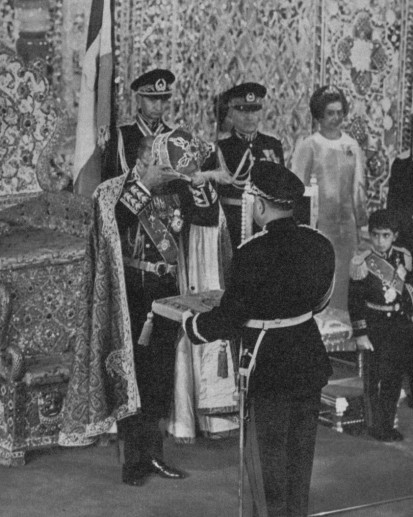 Crowned, wearing the Imperial Robe, the Emerald Belt and bejewelled Sword, and carrying the Imperial Sceptre, His Imperial Majesty The Shah of Iran stands in front of the Naderi Throne in the Grand Hall of the Golestan Palace of Teheran.