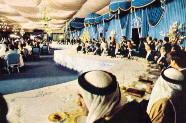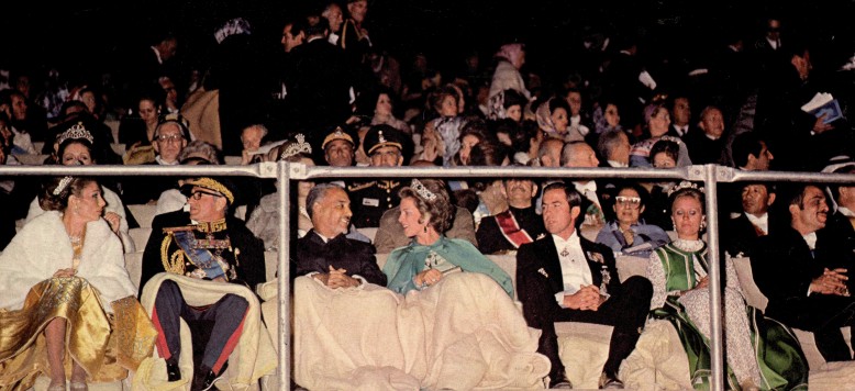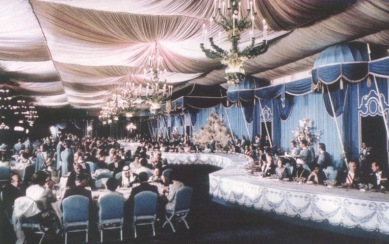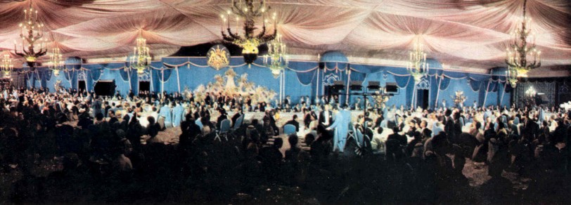 Undoubtedly the banquet of the century, this glittering bash, with such unique and delightful aspects, from the tiaras and orders, to the tables and chandeliers, from the ceiling to the golden peacocks, from the roast peacock to the splendorous titles, was probably also the greatest party ever held. The enchanting anachronism of it all made it even more appealing and exceptional: there, in the very middle of the desert, in the middle of a ruined palace, were all the great leaders of the World: emperors and kings, presidents and prime ministers, capitalists and communists, from the West and the East, from the North and the South, in their grandest dresses, in their most sparkling uniforms; there, in the very middle of the desert, living in a city which seemed brought from a fairytale, with all the comfort and exquisite glamour that no one had possibly thought of achieving in such an arid place, were all those mighty and prominent people surrounding the only head state that could manage to gather them: His Imperial Majesty The Shah of Iran.