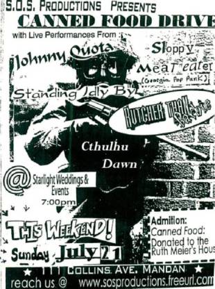 Canned Food Drive Concert Sunday July 21st @ the starlight 111 Collins Ave. Mandan ND bands to perform: Cthulhu Dawn (crust/grind) Johnny Quota (pop punk) Standing Idly By (melodic hardcore) Butcher Than Barbie (pop punk insanity) Sloppy Meat Eaters (Georga pop punk) Admition: CANNED FOOD Donated to Ruther Meier's House everyone should try and make it to this show raid your pantry or something it's for a good cause