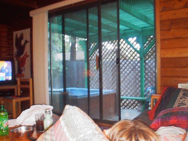 The next few are shots of the cabin I stayed in at Lake Tahoe. This is the view out the door towards the hot tub :) I'm not sure whose head that is.