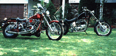 This page wouldn't be complete without sharing a picture of my "dream" truck - a 50's GMC 3-ton flatdeck, stake sides. Now that's a truck!! To the right is a picture of my husband's previous Harley ('77 FXS, Shovelhead)and my 60's Triumph, sweet Tiger bored over to 840cc, light as a feather and a dream to ride. Until one day the right hand (gas) hand grip fell off, almost landing me in a gully... but selling it put me through one year of university... |