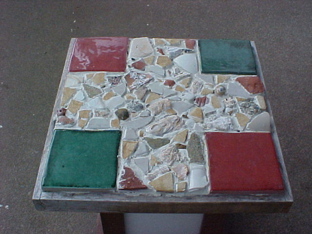 I also do tile mosaic. On the right is a small tabletop made from 4 handmade tiles together with shells and stones I picked up on the beach at Port Townsend, Washington; on the left is a 4x2' countertop - this was my very first mosaic project. |