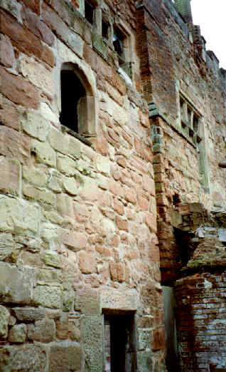 but they are larger and squarer than the other stones. Compare Astley to Baltersan (right), which is ashlar intermixed with rubble, no doubt for economy's sake or due to a paucity of large stones in the area. Note, though, that the window casing is made from accurately hewn stone, and that the sill and lintel are single pieces of stone. A castle like Baltersan may once have been "stuccoed" in limestone, hiding the stonework and rendering the building a gleaming white edifice. This was not an uncommon practice. |