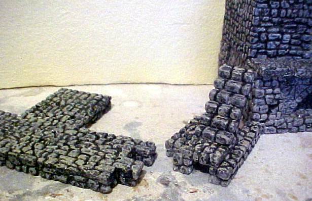 | The stairs are a single unit, which dovetail into the walkway. I glued up a combination of long fieldstone bricks - 2" 4" 2" 4" - which I molded and can now cast them as one piece. Turned around, one fits into the other. And the 2" width allows two RPG characters to pass each other or walk two abreast. | ![]() |