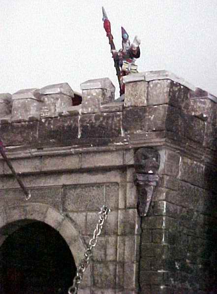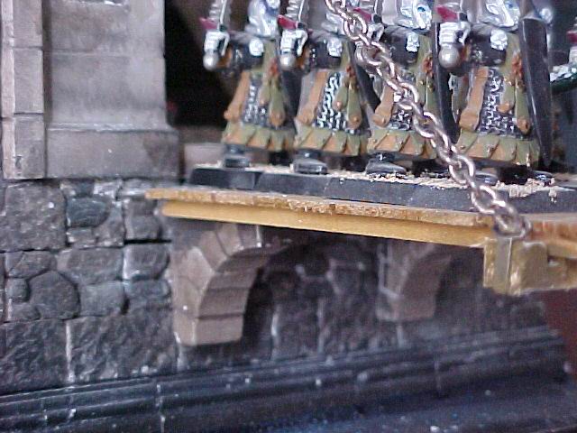 I used arch supports from the Castlemolds Prison mold; the drawbridge rests on these when it is down. The chains are not winched or anything fancy, they can be pulled from inside through holes I drilled through the plaster. In retrospect, I would have used two arches from the prison mold to make a circle through which the chain could run. I wouldn't have worried about damage to the plaster, as it would look like realistic damage. | ![]() |
