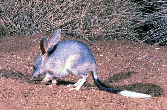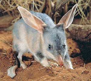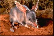 The Bilby is 30-45cm in length (including about 25 cm tail) and weighs 1-2kg. It is a small marsupial and is one of two types of rabbit-bandicoot. The bilby's fur is a bluish grey colour with it's tail being white and black with a distinct raw of hair that the bilby raises high in the air like a flag. It's ears are like rabbits. The bilby doesn't drink very much water because it gets it water from the food it eats. It's diet consists of termites, insects, small animals, roots and is able to obtain its food using its sharp claws, searching for food at dusk. The bilby has very good hearing and sense of smell but has poor eye sight. The only form of camouflage is to hide in its burrow and venture out at night time for food. Its colouring blends into the Australia bush and desert.