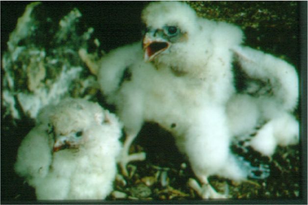 Peregrine Falcons are able to breed at 3 years of age. The breeding season probably begins in March and extends into May. Nesting habitat is highly variable, including more traditional cliffs or trees, and man-made structures like towers and the ledges of tall buildings. The nest is usually a scrape lined with fine materials. The female lays 2-6 (usually 3-4) eggs that she incubates for 29-32 days. The incubating female is fed by the male. The young are semi-altricial and stay in the nest for 35-42 days after hatching. Juvenile birds are dependent on their parents for care for several months after they hatch.